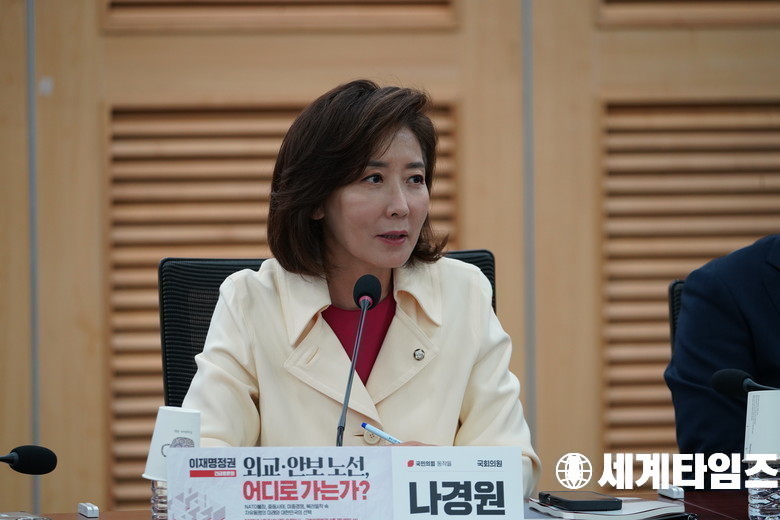 '나경원' 국민의힘 의원이 26일 오전 서울 여의도 국회 의원회관에서 '이재명정권 외교·안보 노선, 어디로 가는가' 긴급토론회를 연 자리에서 발언하고 있다.