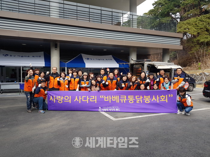 [대전=세계타임즈 이장성 기자] 다양한 봉사를 하고 있는 SNS 6천명 봉사단체 사랑의 사다리 밴드(리더 이정제)는 7일 오후2시 동구 아름다운복지관(관정 최재천)에서 동구지체장애인협회 250명의 회원들에게 바비큐통닭 봉사로 우리 사회의 따뜻한 정을 나누었다