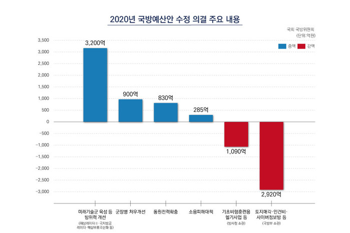 국방위원회는 2020년도 국방예산안을 심사하면서 미래기술군 육성을 위한 첨단 전력의 신속 구축에 중점을 두어 방위사업청 소관 예산 약 3,200억원을 증액 하였다.