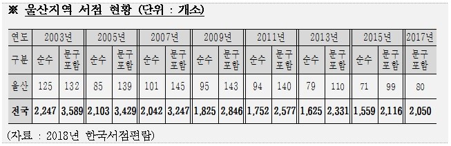 한편, 2017년 말 울산지역 서점(문구포함)은 2003년 132개소였으나 2007년 145개소를 정점으로 꾸준히 감소하여 2017년에는 80개소로 감소하였다. 이는 2003년 대비 39.4%의 감소률을 보이고 있다.