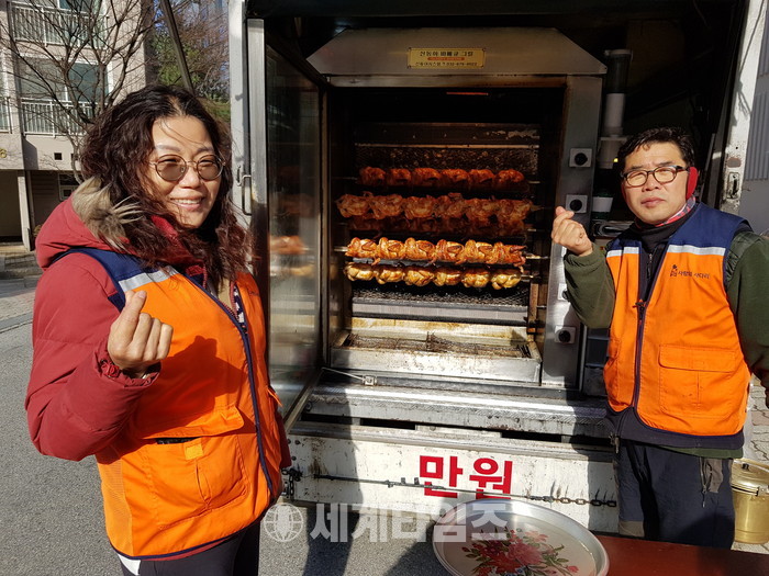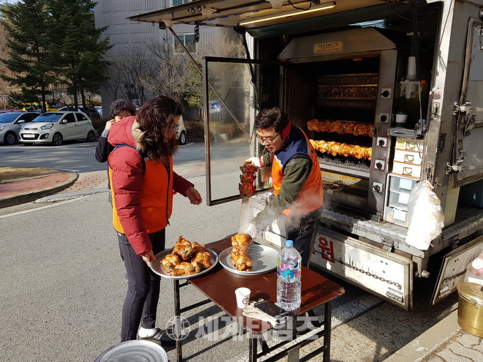이날 봉사에는 신상일 회장, 김재근 총무, 김경옥 유성구새마을부녀회장이 추운날씨에도 참석을 하여 즉석에서 구운 바베큐 통닭 봉사를 하였다.