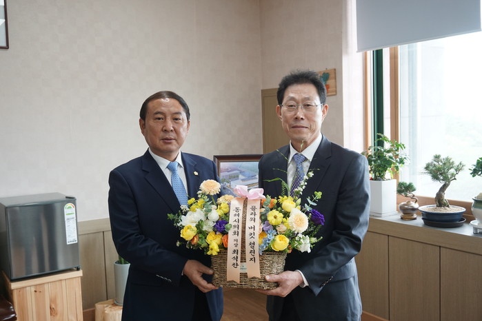 [동해시=세계타임즈 윤일권 기자] 동해시의회 최석찬 의장은 26일 강원도동해교육지원청에서 장재만 교육장에게 코로나19로 어려움에 빠진 화훼농가를 돕자는 취지의 '플라워 버킷챌린지' 일환으로 꽃다발을 전달했다.