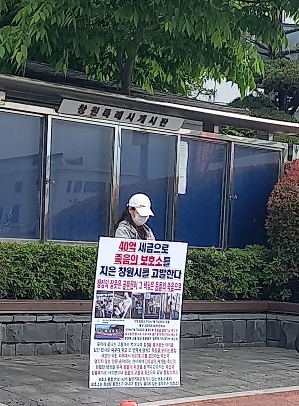 (동물공감연대가 지난 5월 1일부터 창원시청 앞에서 통합 유기견보호소의 규모 문제를 두고 1인 시위를 벌이고 있다. 사진=동물공감연대)