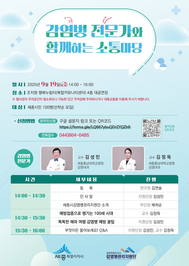 이날 행사에서는 세종시 감염병관리지원단에 대한 소개와 함께 평소 시민들이 궁금해 할만한 감염병 예방을 주제로 한 특강이 진행된다.