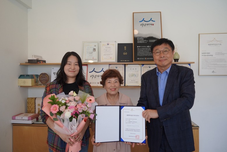 | ▲ 세종 뿌리깊은 가게 인증서 전달(왼쪽부터 한씨떡집 조수아 실장, 한임희 대표, 이승원 경제부시장) |