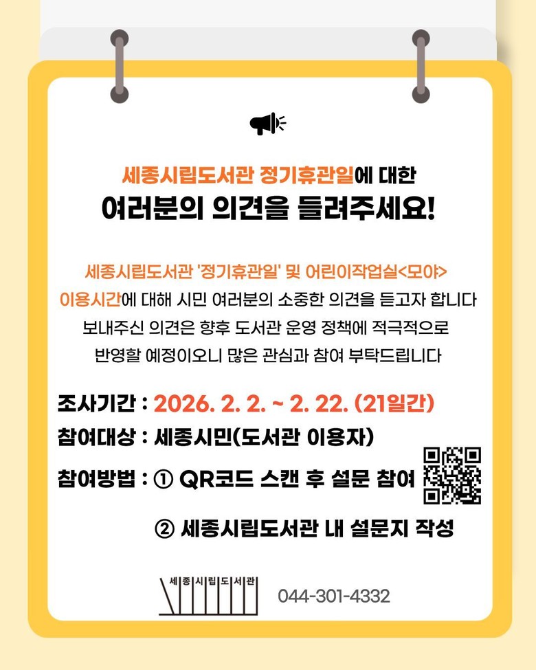 의견 조사는 세종시립도서관 누리집을 통한 온라인 설문과 도서관 내 비치된 설문지 작성을 통해 누구나 참여할 수 있다.