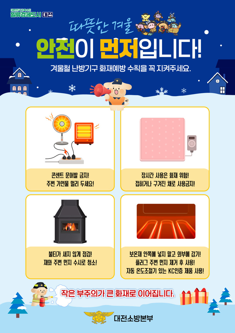 김문용 대전소방본부장은 “겨울철 난방용품은 따뜻함을 주는 필수품이지만, 부주의한 사용은 큰 화재로 이어질 수 있다”며 “시민 여러분께서는 난방용품 안전수칙을 철저히 지켜 따뜻하고 안전한 겨울을 보내시길 바란다”고 말했다.