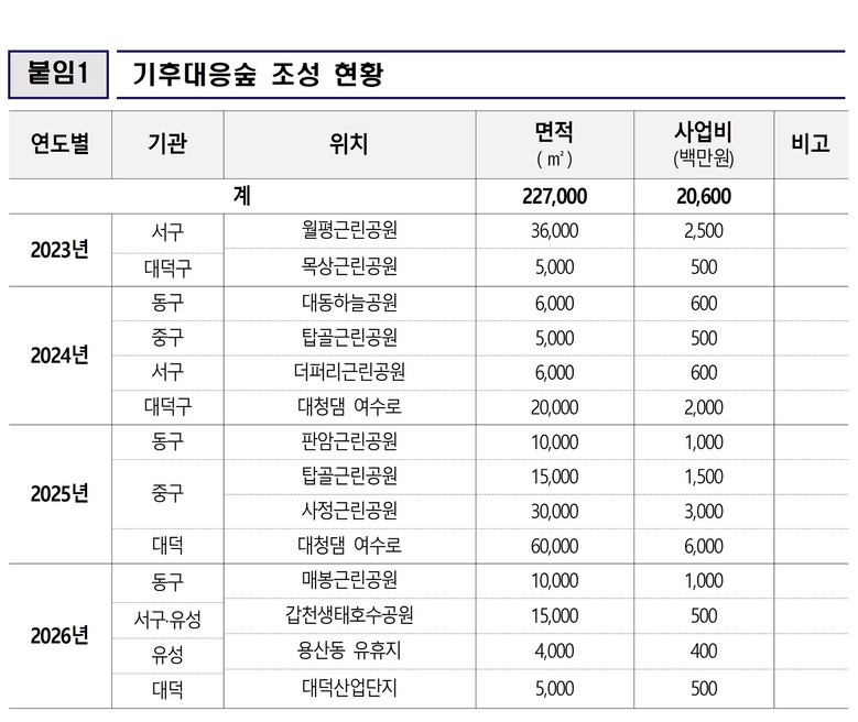 대전시는 2026년에도 24억 원을 확보해 ▲대덕산업단지(0.5ha) ▲매봉근린공원(1ha) ▲갑천생태호수공원(1.5ha) ▲용산동 유휴지(0.4ha) 4곳에서 청정숲 조성을 이어갈 계획이다.
