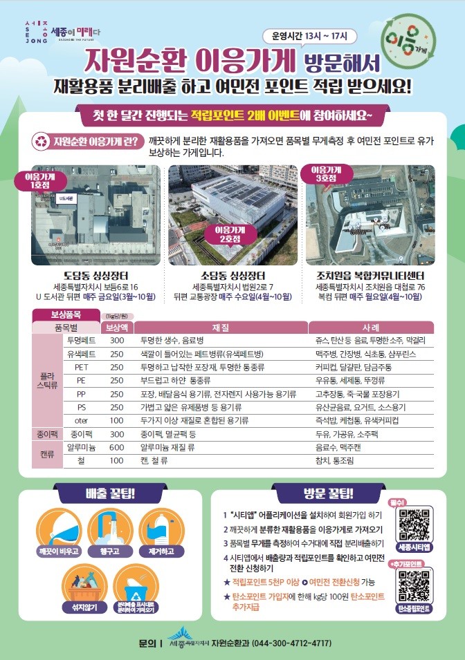 한편 지난해 8월부터 운영된 도담동 자원순환 이응가게에는 시민 200여 명이 이용했고 고품질 재활용품 총 272㎏을 수거했다. 여민전 포인트는 ㎏당 보상단가에 따라 24만 8,000원을 지급했다.