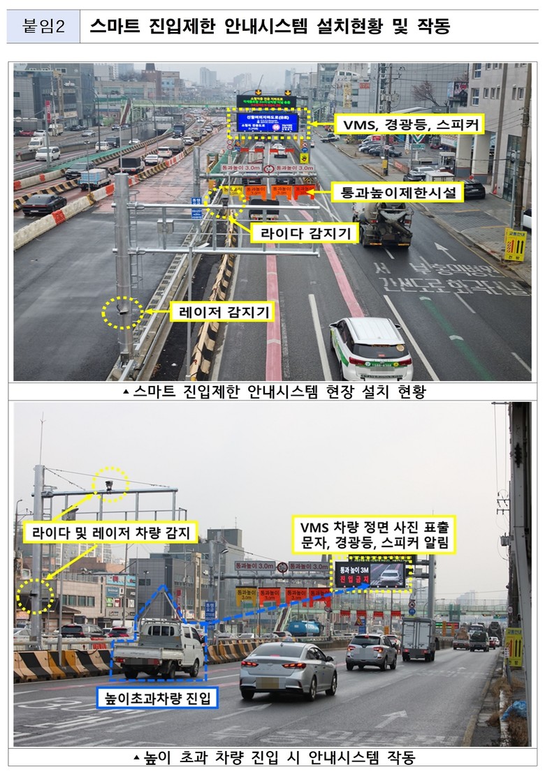 ‘스마트 진입제한 안내시스템’은 차량이 지하도로에 진입하기 전 차량 높이를 측정해, 기준을 초과할 경우 즉시 운전자에게 알리고 우회를 유도하는 사전 예방형 안전 시스템이다.