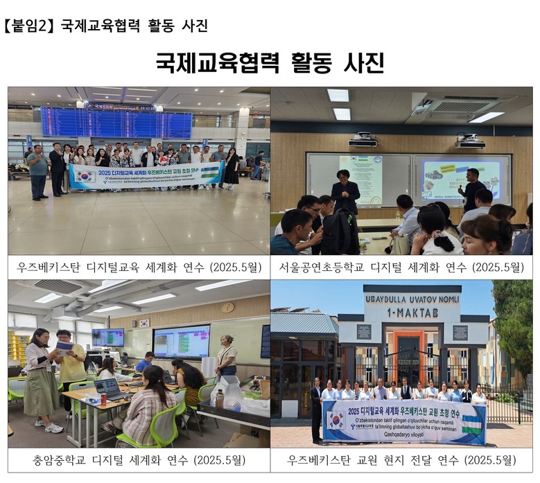 국제협력 범위도 한층 확대되고 있다. 5월에는 우즈베키스탄 교원 30명을 초청해 연수를 진행했고, 9월에는 미주개발은행(IDB)과의 면담을 통해 디지털교육을 포함한 정책 교류를 추진했다. 이어 10월 중순~11월 중에는 일본 나가사키현과 중국 청두시 교육청 관계자들이 서울을 방문해 디지털교육 현장을 직접 참관할 예정이며, 프랑스 일드프랑스 교육청과는 디지털교육 분야 협력을 위한 실무 협의를 이어갈 계획이다.