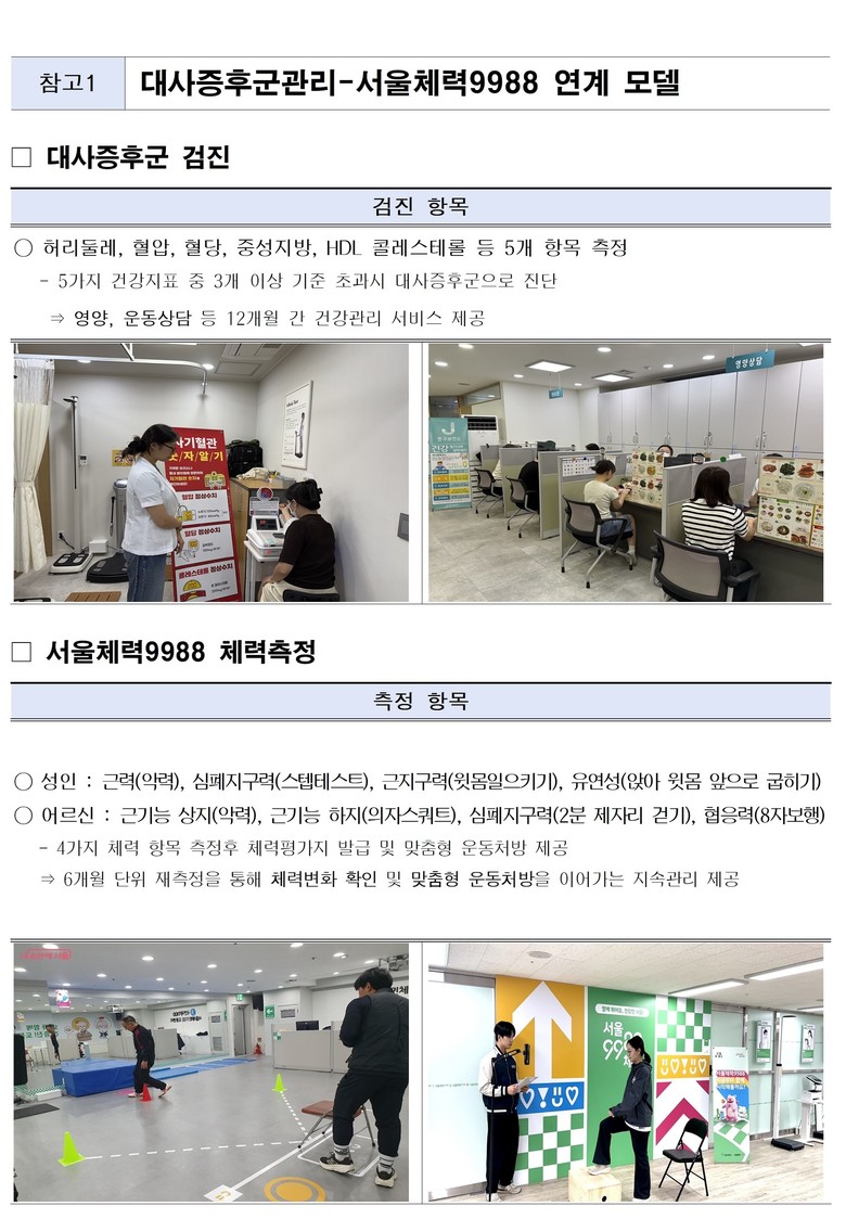 - 혈압‧혈당 등 대사증후군 진단 및 상담, 체력 측정 후 맞춤형 운동처방까지 통합 서비스