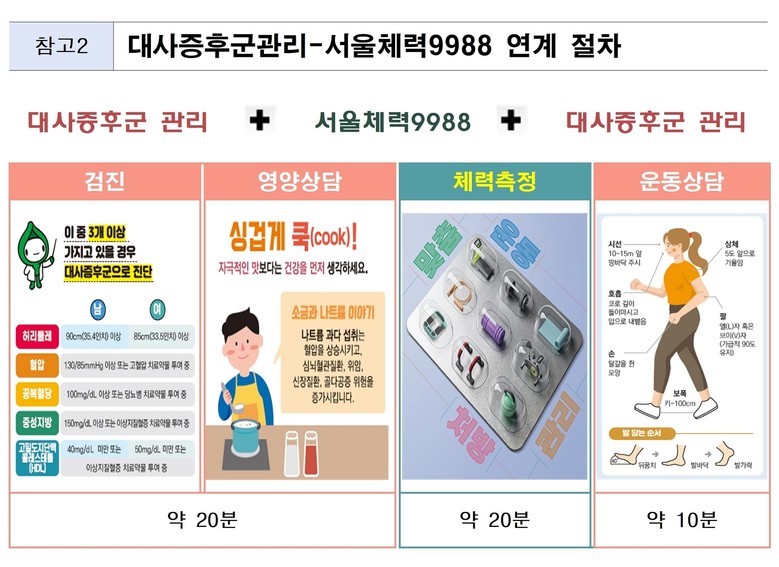 서울시는 ‘대사증후군 관리 사업’과 ‘서울체력9988’ 연계를 통해 검진~상담~체력 관리로 이어지는 시민 건강관리 체계를 한층 촘촘히 하고 대사증후군 등 만성질환 예방은 물론 시민 체력 증진, 건강한 생활 습관 형성에 실질적인 도움이 될 것으로 기대하고 있다.