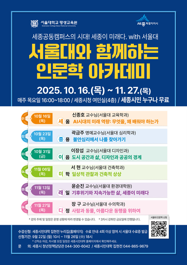 서울대학교 인문학 아카데미는 오는 11월 27일까지 매주 목요일(3차시만 금요일) 오후 4시부터 6시까지 세종시청 여민실에서 미래교육, 철학, 사회, 환경 등 다양한 주제로 총 6회에 걸쳐 운영된다.