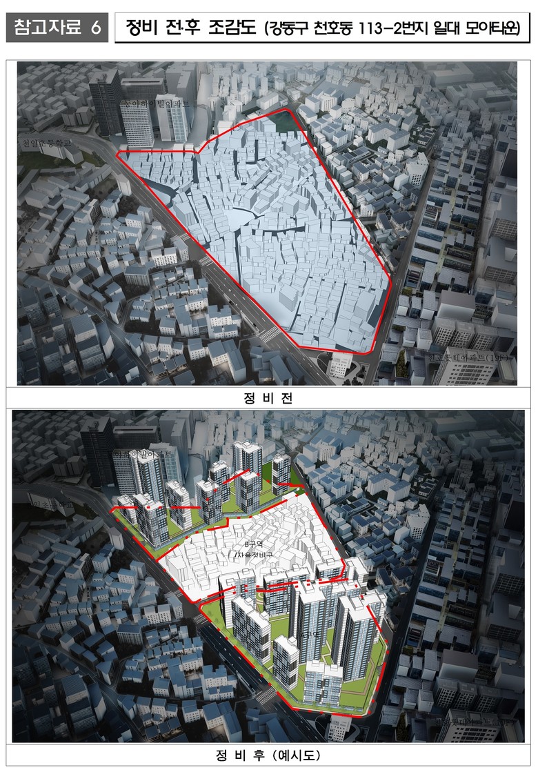강동구 천호동 113-2번지 일대(면적 58,335㎡)는 모아주택 2개소를 추진해 기존 403세대에서 568세대 늘어난 총 971세대(임대 233세대 포함)를 공급한다.