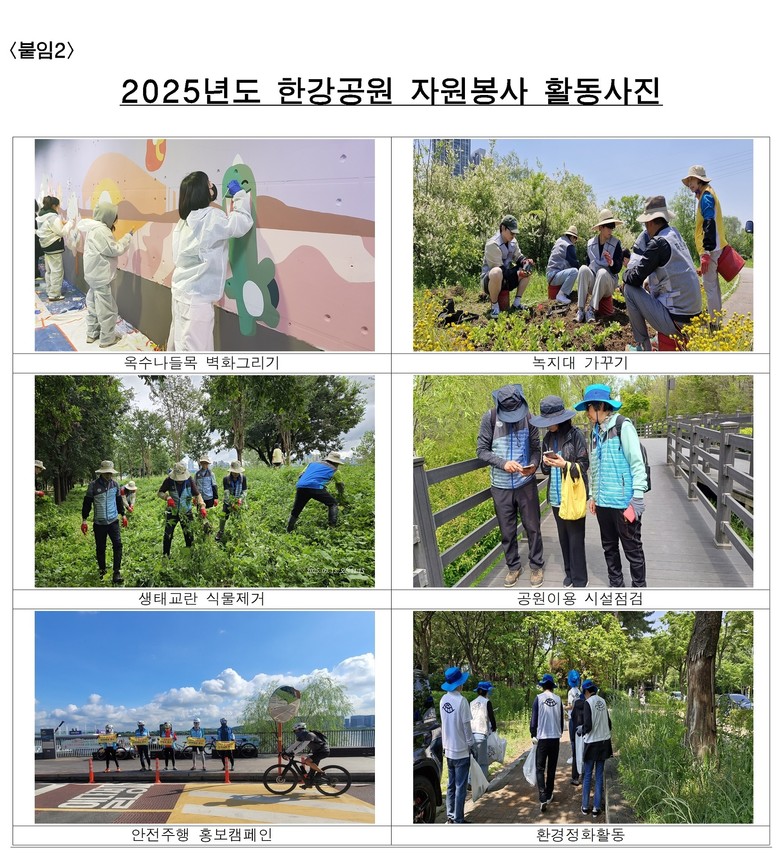 또한, 단체 봉사자를 위한 활동도 지속된다. ▲환경정화와 녹지대 가꾸기를 통해 한강 전역을 돌보는 ‘한강 지킴이’ ▲예술적 재능으로 노후 시설물을 새롭게 꾸미는 ‘재능기부 벽화봉사단’ 등 기존의 인기 분야에 신규 기획형 봉사단을 더해, 보다 풍성하고 체계적인 자원봉사 생태계를 구축할 계획이다.