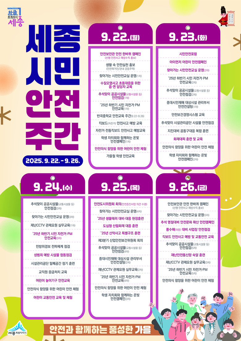 또 15일부터 세종시 누리집, 사회관계망서비스(SNS), 버스정보시스템(BIS), 전광판, 홍보물 등을 통해 시민안전주간 집중 홍보를 펼칠 예정이다.