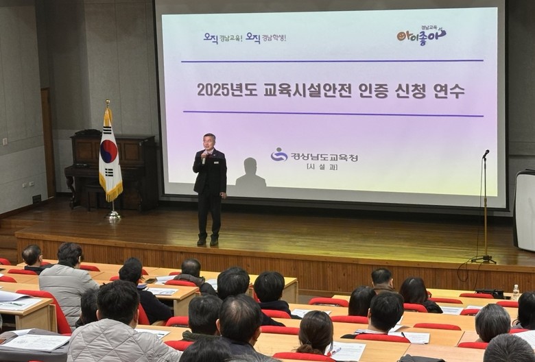 [경남 세계타임즈=최성룡 기자] 경상남도교육청(교육감 박종훈)은 20일 경상남도교육청 예술교육원 해봄에서 교육 시설 안전 인증 대상 학교 담당자 170여 명을 대상으로 ‘2025년도 교육 시설 안전 인증 역량 강화 연수’를 열었다.