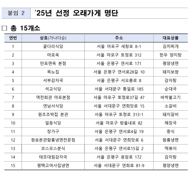 올해는 미식 관광 수요에 발맞춰 서북권(마포·은평·서대문)을 중심으로 15개 가게를 신규 선정해 현재까지 오래가게는 총 140개소이다.