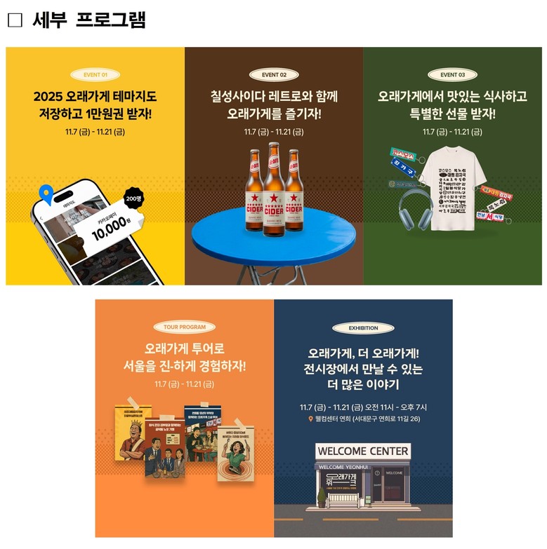 이 밖에도 ‘오래가게 투어’나 ‘단골부심콘테스트’ 등 다채로운 현장 참여형 프로그램이 진행되며 ‘카카오톡 예약하기’ 채널을 통해 사전 신청할 수 있다.