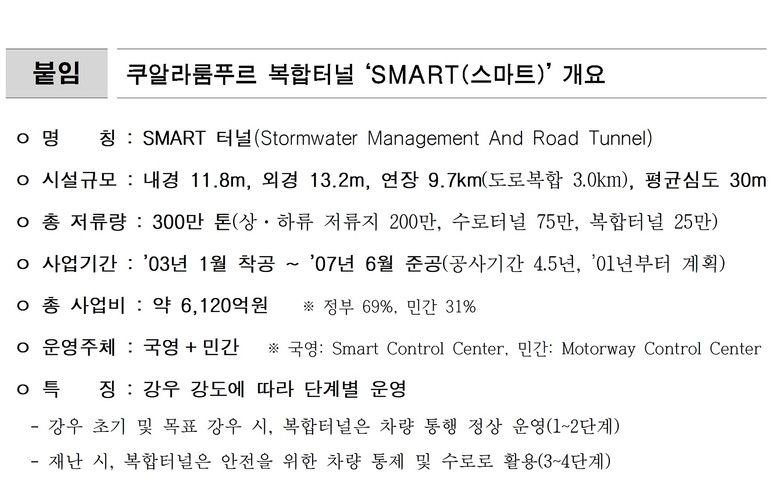말레이시아 정부는 비가 오면 수시로 넘쳤던 클랑강 범람을 막고 평상시에는 쿠알라룸푸르 시내 교통 정체를 해소하기 위해 '07년 복합터널 ‘SMART’를 건설했다. 일정 강우량 이상 비가 내리면 차량 통행을 통제하고 하천 유량을 조절하는 통로로 사용한다.