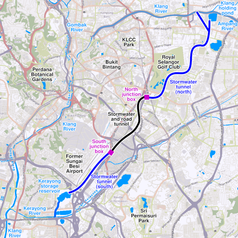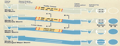 터널.저류지 등 전체 저류용량은 총 300만 톤에 달하며 강우 시 클랑강 홍수를 상부 저류지(Berembang Holding Pond)에서 터널로 흘려보내 저류하고, 비가 그치면 터널 하부 저류지(Desa Attenuation Pond)를 통해 케라용강에 방류한다.