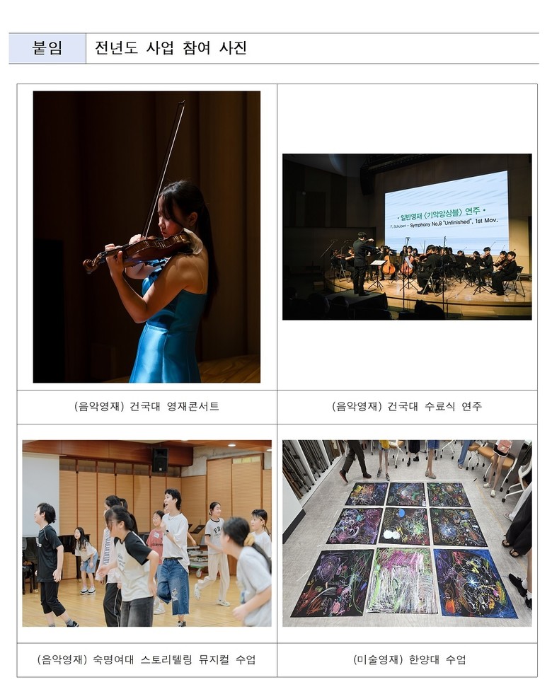 교육은 올해 12월까지 운영되며 전공실기 1:1 레슨을 비롯해 여름캠프, 마스터클래스 등 다양한 프로그램으로 구성된다. 또한 11월에는 연주회와 전시회를 개최해 교육과정을 통해 성장한 학생들의 성과를 선보일 예정이다.
