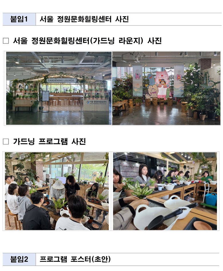 참가자들은 흙을 직접 만지고 식물을 심으며 나만의 반려화분을 제작하는 과정에서 식물과 교감하는 시간을 갖는다. 이를 통해 정원을 단순히 감상하는 대상이 아니라, 생활 속에서 자연스럽게 즐기는 여가이자 회복의 경험으로 체득하게 된다.
