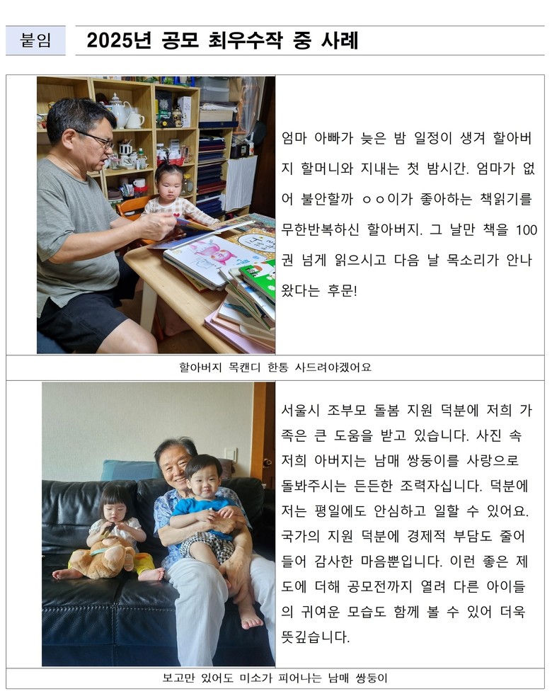 한편, 서울시는 ‘서울형 손주돌봄수당’ 참여 가족을 대상으로 세대 간 정서적 유대 강화와 돌봄가치 공유를 위한 사진‧수기 공모전을 2월3일(화)~10일(화)(총 8일간) 개최한다.