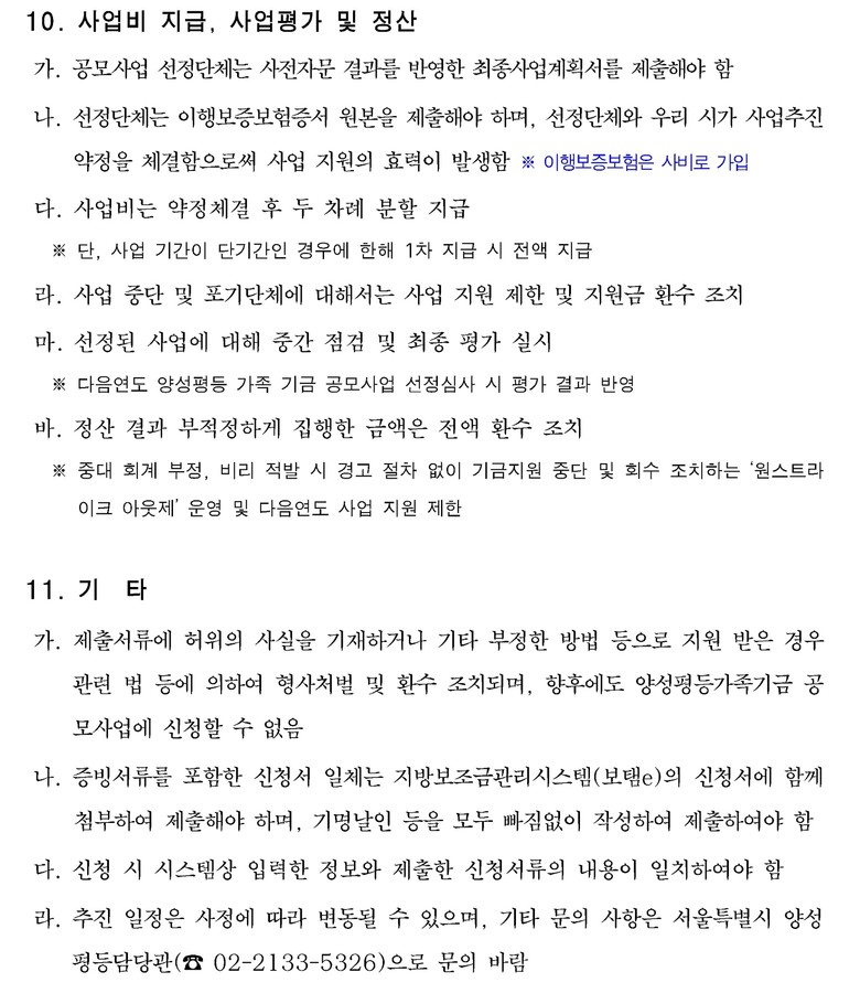 서울시는 사전 신청한 단체들을 대상으로 오는 14일(수) 사업설명회를 개최할 예정이다. 사업설명회에서는 사업내용, 신청방법(지방보조금관리시스템(보탬e)), 심사기준, 사업 능력이 없거나 부적정한 단체 참여 배제를 위한 현장점검 등을 상세히 설명할 예정이다.