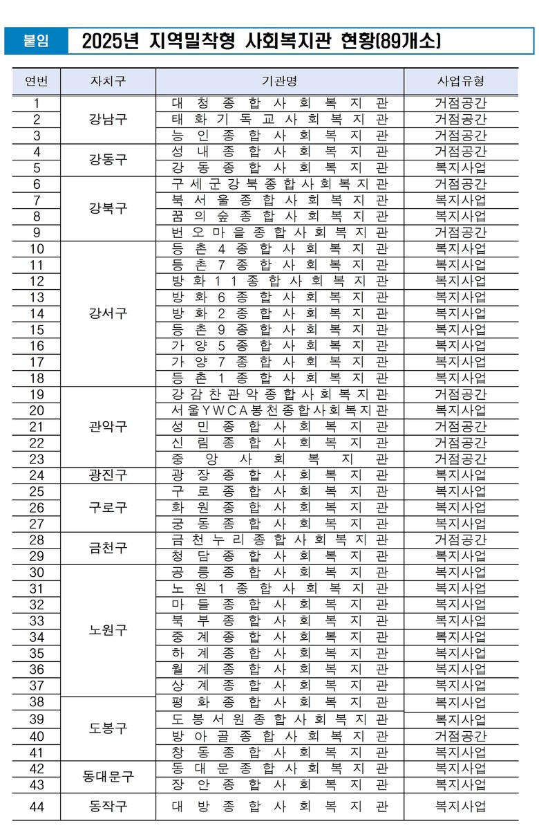 또한 복지관별 평균 7.6개의 공공기관, 19.4개의 민간기관과 협력 네트워크를 구축하며 주민센터와 복지관이 함께 동 단위 복지안전망의 핵심 역할을 수행하고 있다.