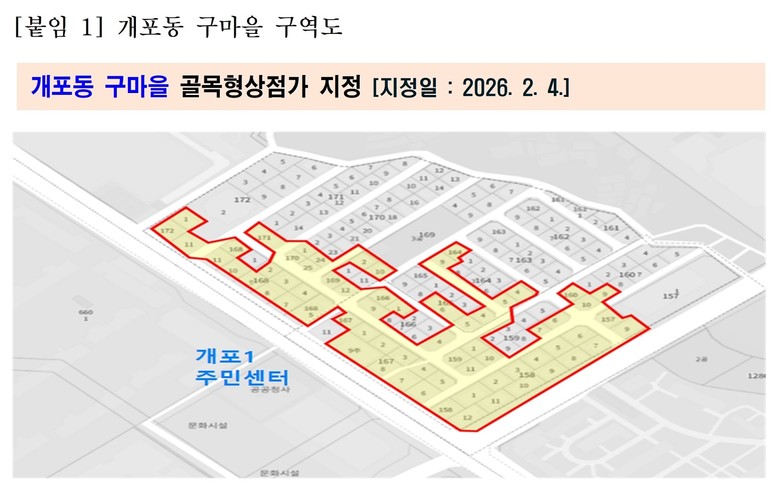 이번에 지정된 구마을 골목형 상점가는 개포동 165-4 일원에 위치한 생활권 상권이다. 면적 15,589㎡ 구역에 음식점, 학원, 병원 등 117개 점포가 밀집해 있다. 구는 상권의 활성화 필요성과 발전 가능성을 종합적으로 고려해 골목형상점가로 지정했다.