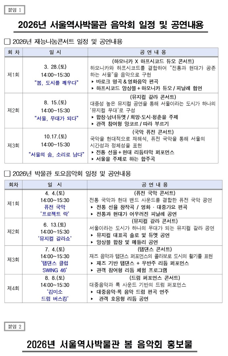 서울역사박물관은 2026년에‘재능나눔콘서트’3회와‘박물관 토요음악회’4회 등 다양한 음악 공연 프로그램을 운영하여 시민을 위한 문화공연 무대를 마련하여 시민들의 문화향유 기회를 확대할 계획이다.