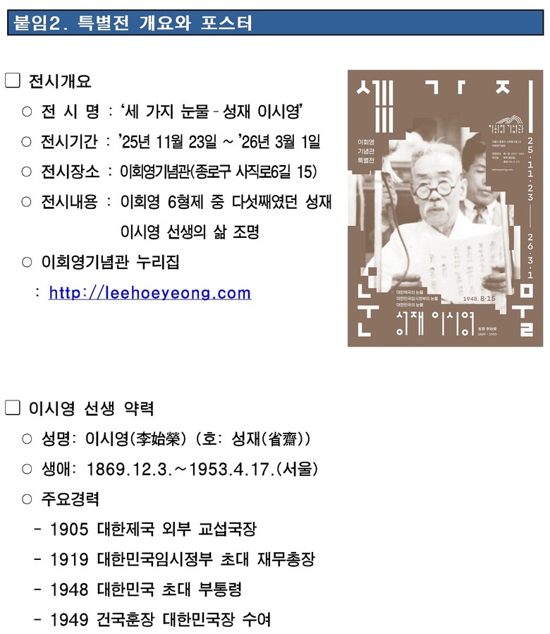 - 시 “을사늑약 120주년․광복 80주년 맞아 우리 역사 성찰하는 뜻깊은 시간 되길” [서울 세계타임즈=이장성 기자] 서울시는 초대 부통령 성재省齋 이시영 선생의 생애를 조명하는 특별전 <세 가지 눈물–성재 이시영>을 ’26년 3월 1일(3·1절)까지 이회영기념관에서 진행한다고 밝혔다.