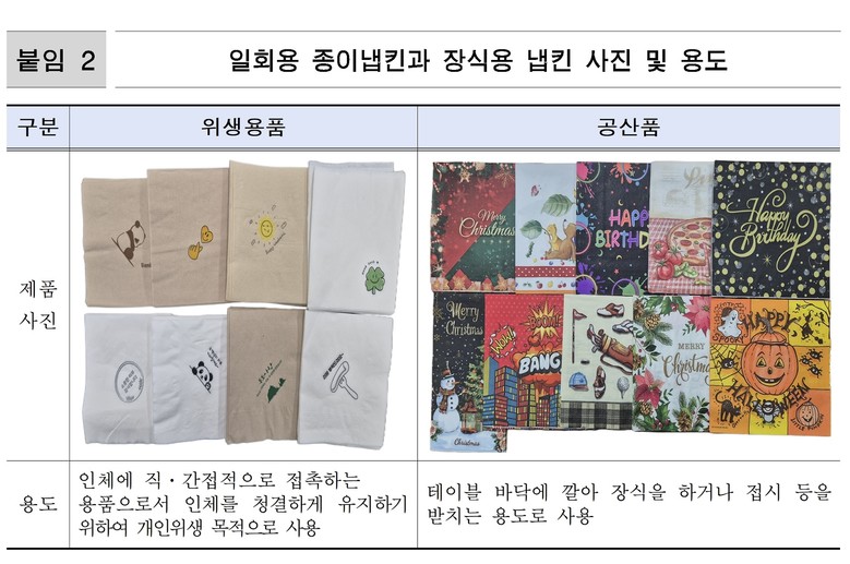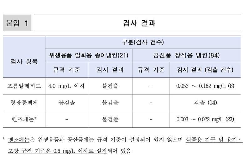 - 일회용 종이냅킨은 ‘위생용품’으로 관리, 검사 항목 모두 불검출
