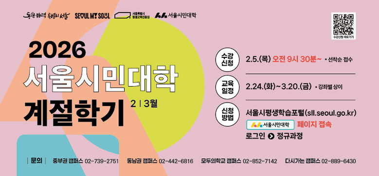 이번 계절학기는 2월 24일(화)부터 3월 20일(금)까지 4주간 운영되며, 서울시민대학 중부권·동남권·모두의학교·다시가는 캠퍼스 4곳에서 열린다. 모든 강좌는 서울 시민 누구나 무료로 참여할 수 있다.