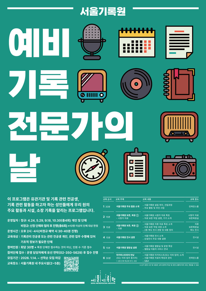이와 함께 기록 분야 전공자를 위한 「예비 기록 전문가의 날」은 4월·5월·9월·10월 마지막 주 금요일 운영되며, 「기록 활동가 양성과정」 등 전문교육도 연중 추진된다.