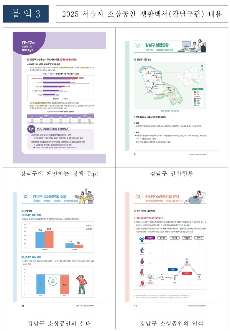생활백서 ‘자치구편’은 25개 자치구별로 ▲정책 Tip ▲일반현황 ▲소상공인의 실태 ▲소상공인의 인식 등 네 개의 목차로 구성됐다.
