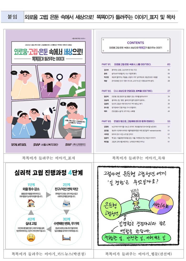 「외로움·고립·은둔 속에서 세상으로! 똑똑이가 들려주는 이야기」모음집은 고립예방플랫폼 ‘똑똑’(sihsc.welfare.seoul.kr)에서 내려받을 수 있다.