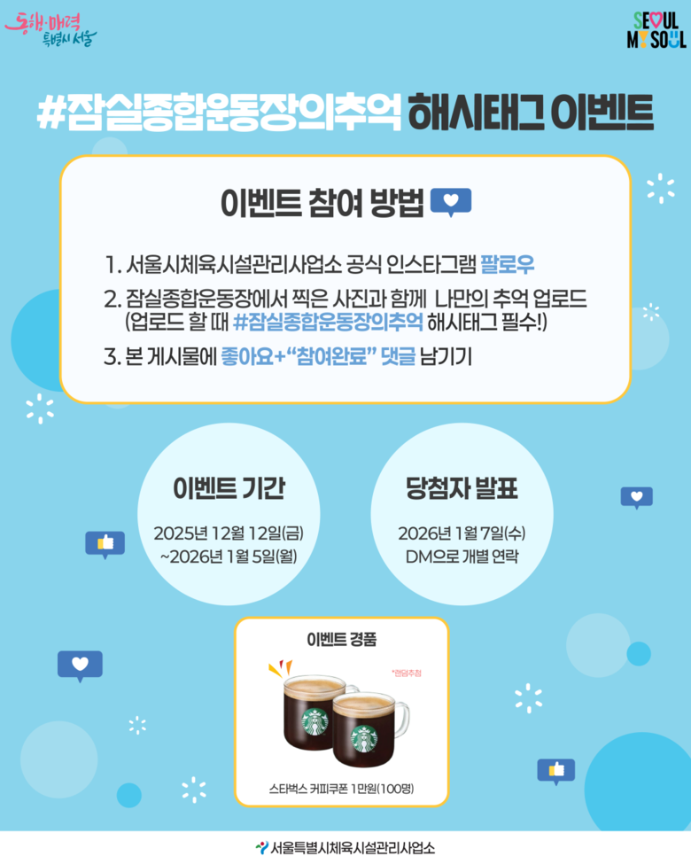 – 디지털 아카이브와 연계한 시민 기억 수집 일환으로 진행 [서울 세계타임즈=이장성 기자] 서울시 체육시설관리사업소(이하 ‘사업소’)는 잠실종합운동장에서 시민이 경험한 다양한 추억과 기억을 수집하기 위한 SNS 이벤트 「#잠실종합운동장의 추억 해시태그 이벤트」를 2026년 1월 5일(월)까지 진행한다고 밝혔다.