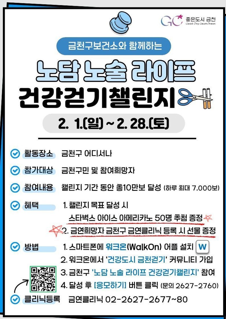 참여 방법은 모바일 앱을 활용한 비대면 방식으로 진행된다. 워크온(WalkOn) 앱을 설치한 뒤 ‘건강도시금천 금천구보건소’ 커뮤니티에 가입하고, 챌린지 ‘설 건강 한 걸음 프로젝트’나 ‘노담 노술 라이프 건강걷기’에 참여하면 된다. 원하는 경우 2개 챌린지 모두 참여할 수 있다.