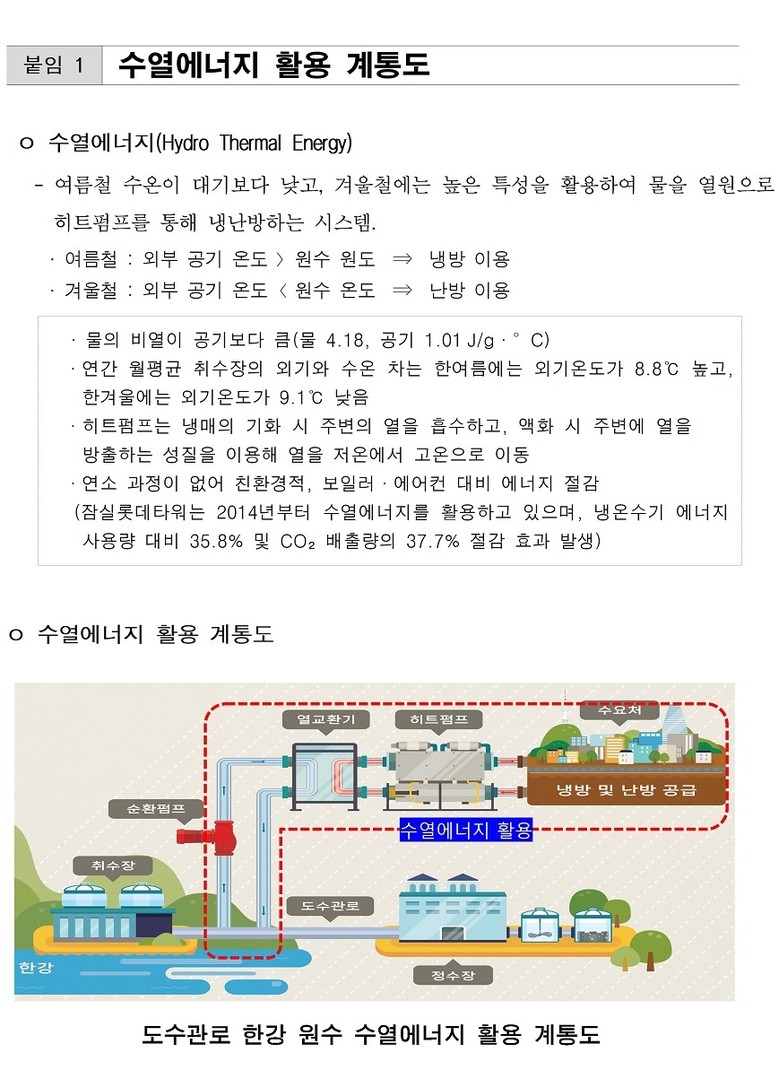 - 상수도 도수관로 인프라 활용…건물 냉난방 열원을 100% 수열에너지로 전환