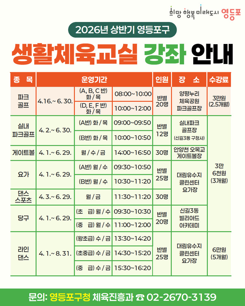 - ‘실내 파크골프 교실’ 신설…구민들의 수요 반영 [영등포구 세계타임즈=이장성 기자] 영등포구(구청장 최호권)가 구민의 건강 증진과 생활체육 활성화를 위해 올해 상반기 생활체육 교실 참여자를 모집한다고 밝혔다.