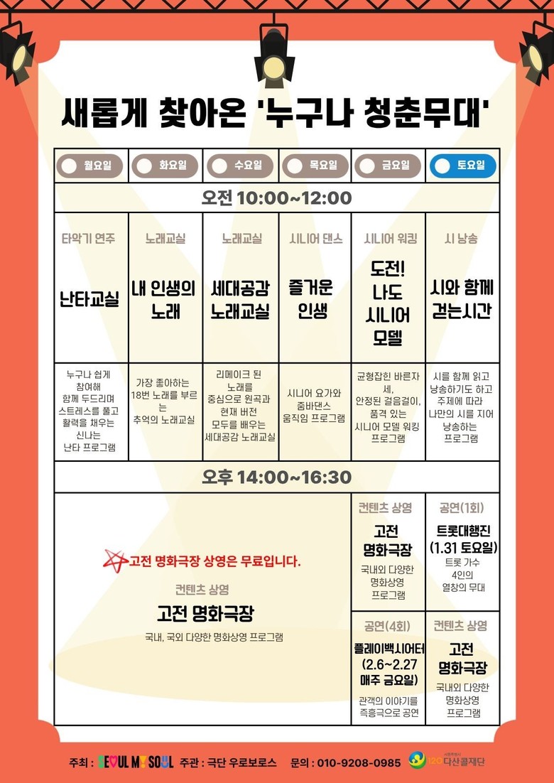 김태희 서울시 문화본부장은 “‘누구나 청춘무대’의 시범 운영은 겨울철 어르신 쉼터 기능을 수행하는 동시에, 3월 본격 운영을 위한 프로그램 구성과 운영 방식을 사전 검증하는 단계”라며 “시범 운영을 거쳐 여가와 문화 향유 기회가 부족한 어르신들이 편안하고 즐겁게 머물 수 있는 따뜻한 문화공간으로 키워가겠다”라고 말했다.