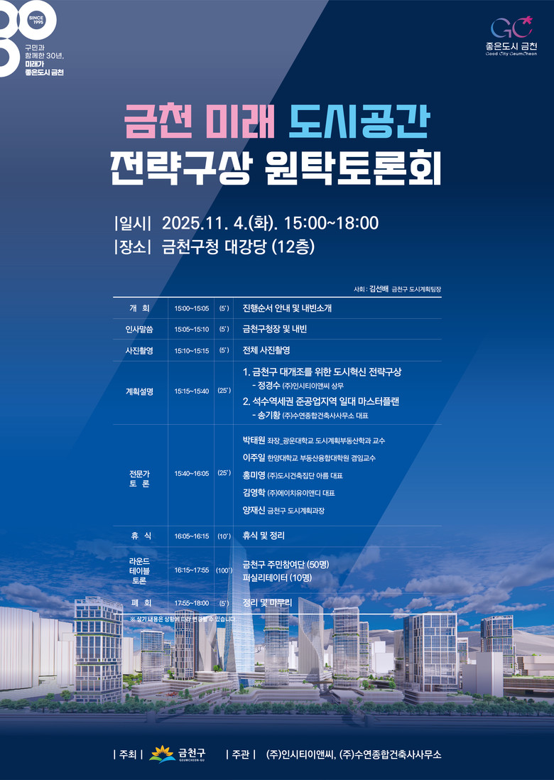 또한 각 분야 전문가들이 참여해 다양한 시각에서 금천의 미래를 논의한다. 분야별 전문가로는 △도시계획분야의 이주일 한양대 부동산융합대학원 교수 △도시경제분야의 홍미영 ㈜도시건축집단 대표이사 △도시경관분야의 김영학 에이치유이앤디 대표이사가 참여한다.