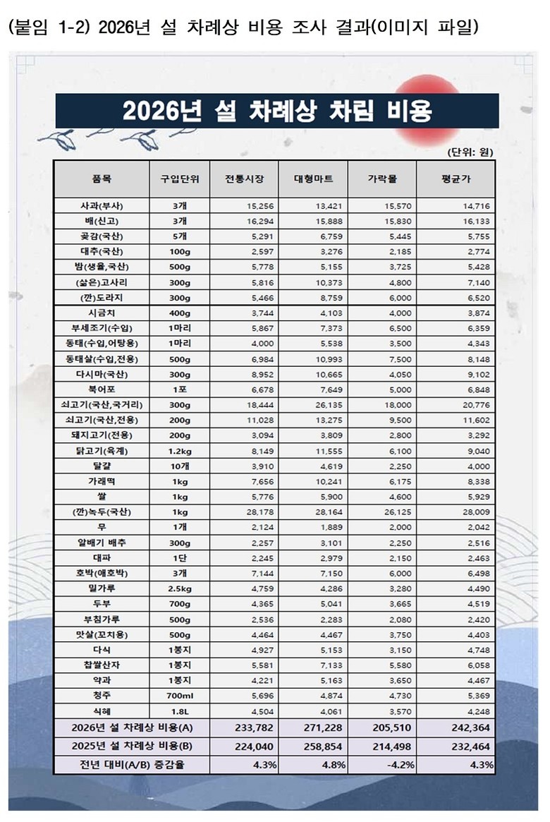 공사는 명절(설·추석) 차례상 차림에 수요가 높은 주요 성수품 34개 품목(6~7인 가족 기준)의 구매비용을 조사해 매년 발표하고 있으며, 금년도 조사 결과 올해 전통시장 구매비용은 233,782원, 대형마트 구매비용은 271,228원으로 전년 대비 각각 4.3%, 4.8% 상승했다.