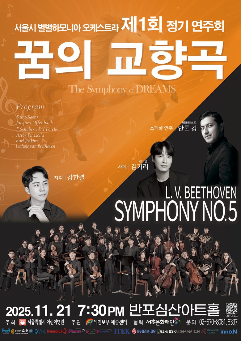 - 개그맨 김기리(사회), 비올리스트 안톤 강(특별연주) 재능기부로 따뜻한 응원과 격려의 메시지 더해 [서울 세계타임즈=이장성 기자] 서울특별시어린이병원(원장 남민)은 오는 11월 21일(금) 19시 30분, 서초문화재단 반포심산아트홀에서 ‘서울시 별별 하모니아 오케스트라’의 제1회 정기연주회 ‘꿈의 교향곡(The Symphony of Dreams)’을 개최한다고 밝혔다.