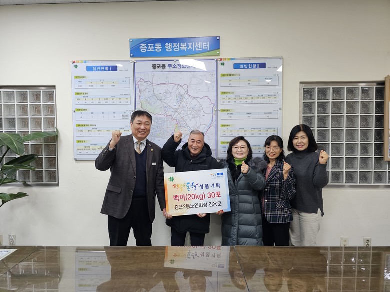 한편, 이날 기탁된 백미 30포는 증포동행정복지센터를 통해 관내 저소득층 가정에 전달될 예정이다.