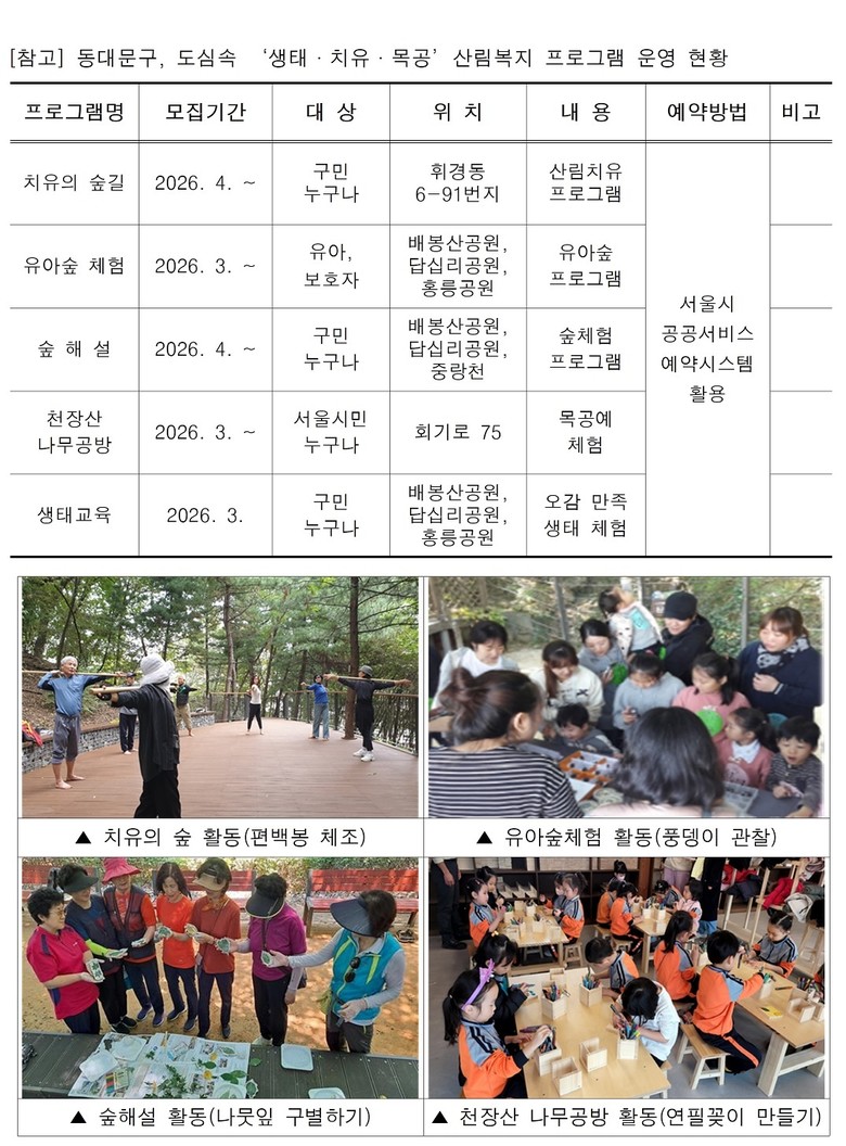 이필형 동대문구청장은 “이번 프로그램을 통해 구민들이 도심 속 자연과 가까이에서 소통하며 새로운 활력을 얻길 바란다”며 “앞으로도 일상 속에서 몸과 마음을 돌볼 수 있는 산림 치유 서비스를 지속적으로 확대해 나가겠다”고 말했다.