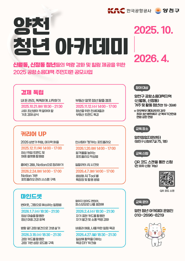 프로그램은 월 1~2회씩 총 10회 과정으로, 신정3동 양천창업지원센터 1층에서 내년 4월까지 진행된다. 회차별 20명 내외의 청년이 참여 가능하며, 신월·신정 지역에 거주하거나 활동 중인 19~39세 청년이 대상이다. 의무복무 제대군인의 경우 최대 3년까지 연령 상한을 연장해 참여 기회를 확대했다.